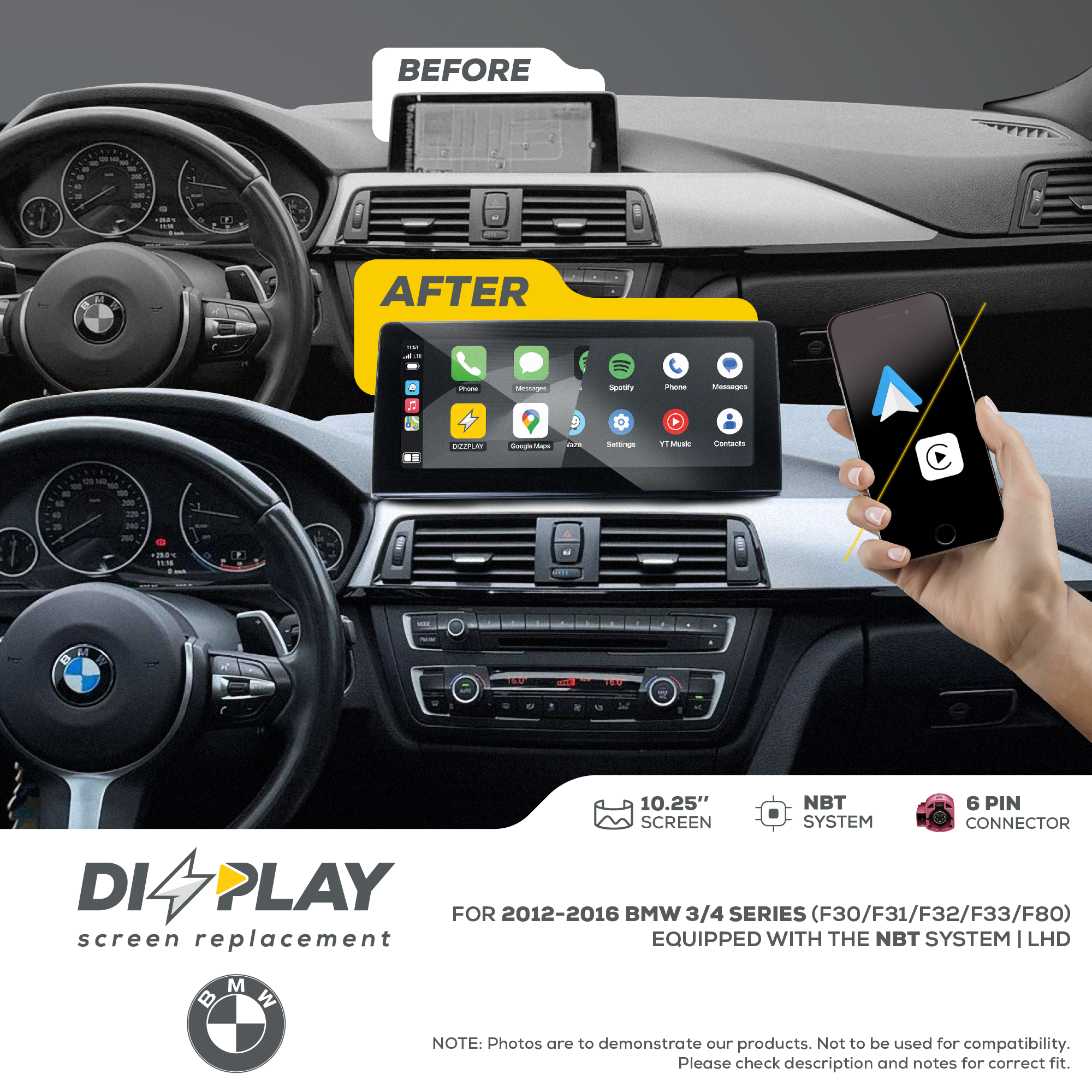 10.25" DIZZPLAY for BMW 3/4 series (F30/F31/F32/F33/F80) 2012*-2016** equipped with the NBT** system.