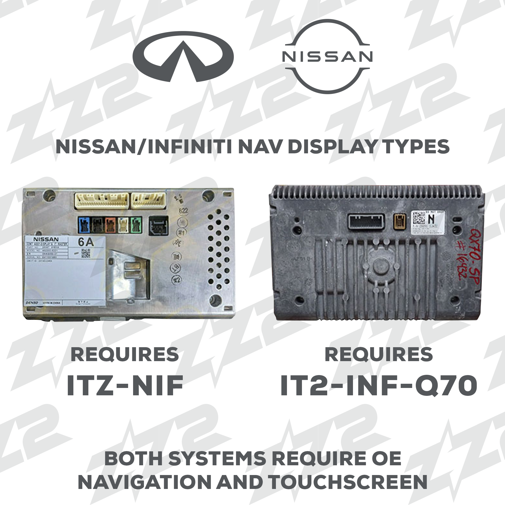 Wireless CarPlay/Android Auto and Cameras input compatible with 2014-2019 Infiniti QX60 and Q70 with factory Navigation.