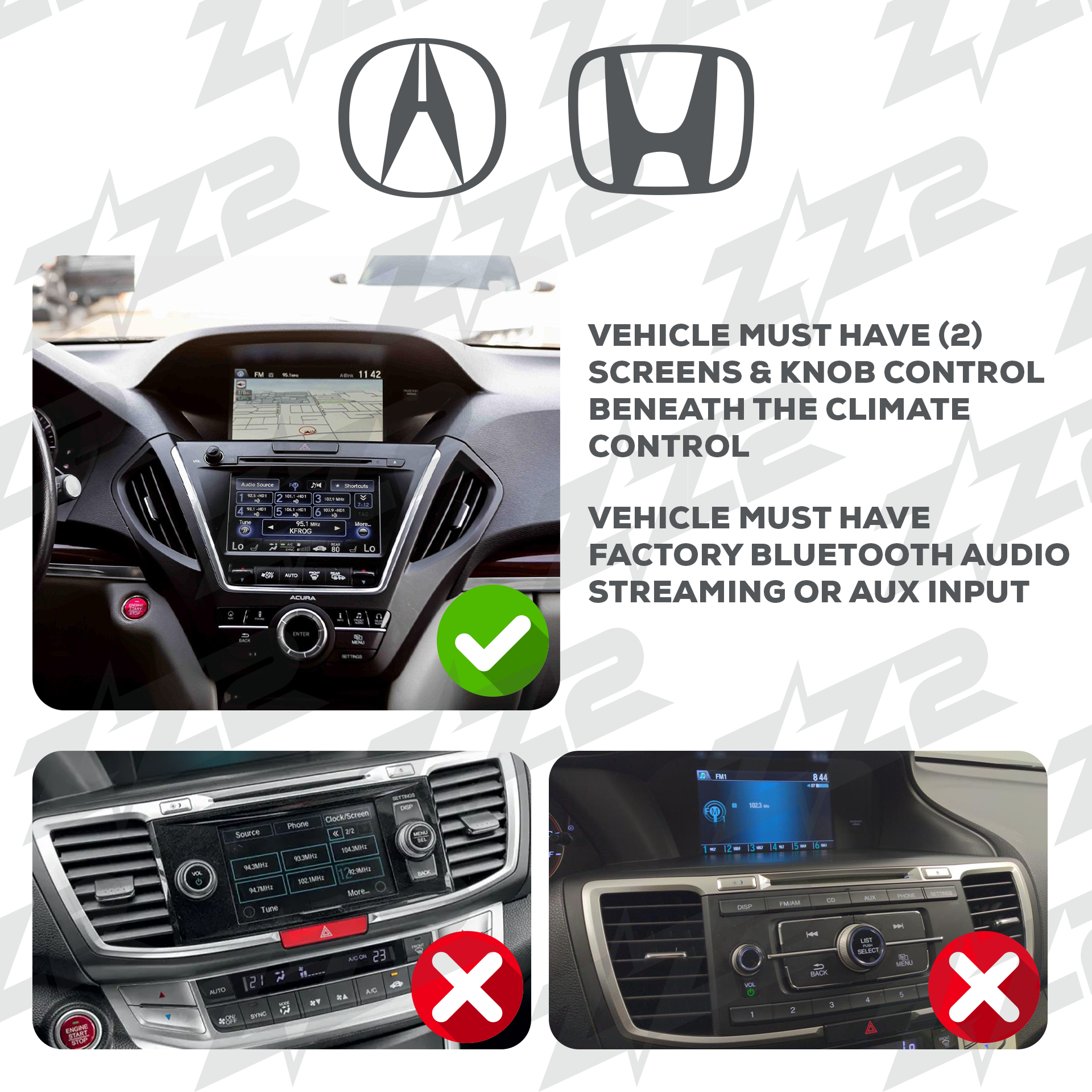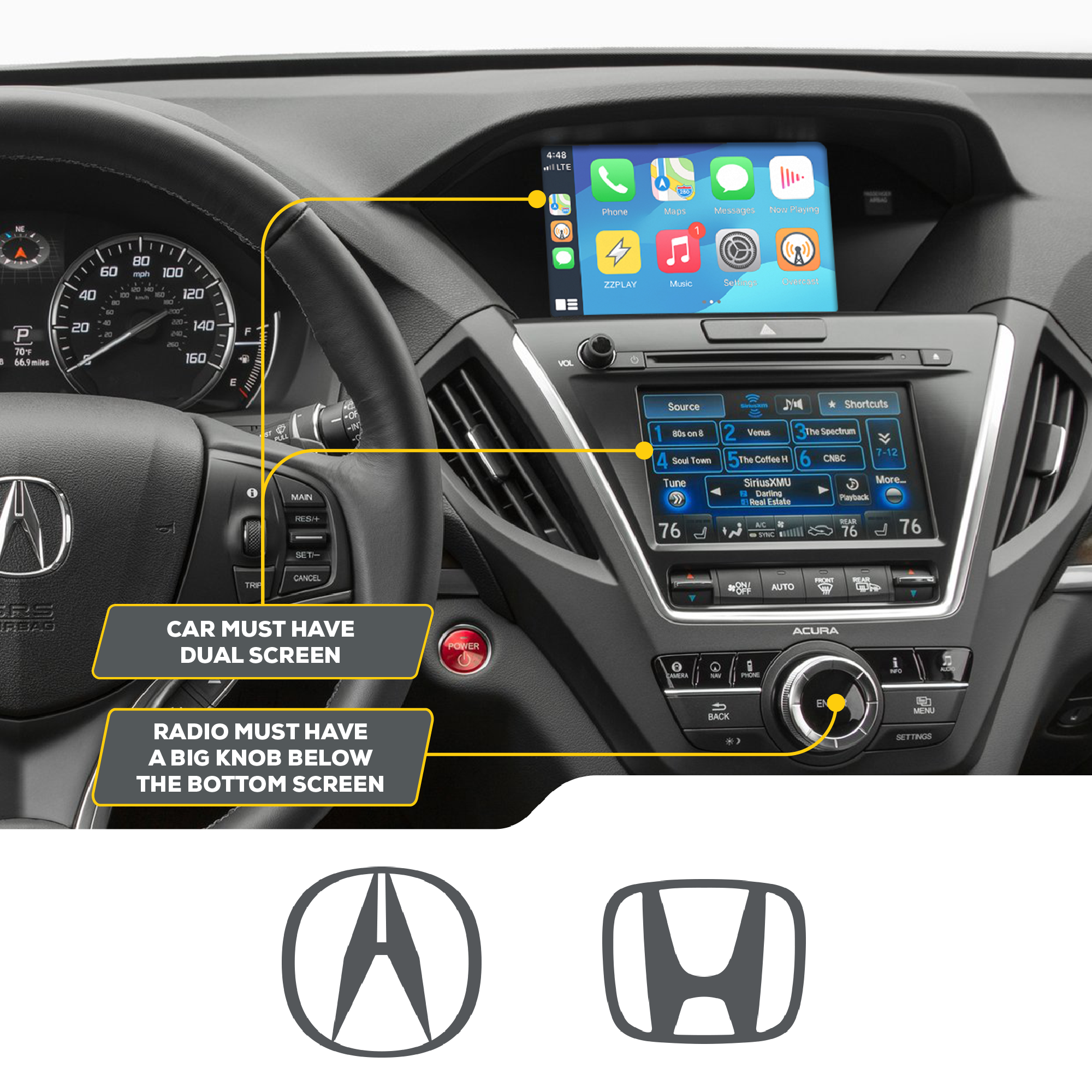 Wireless CarPlay/Android Auto and A/V interface compatible with most of 2014-2017 Honda & Acura vehicles equipped with 2 screens and a separate, lower knob which controls the top screen.