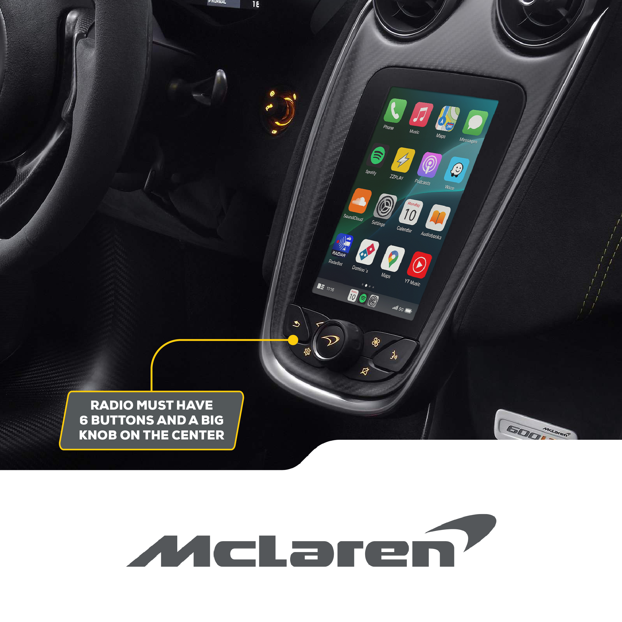 Wireless CarPlay/Android Auto, Camera and A/V interface compatible with McLaren.