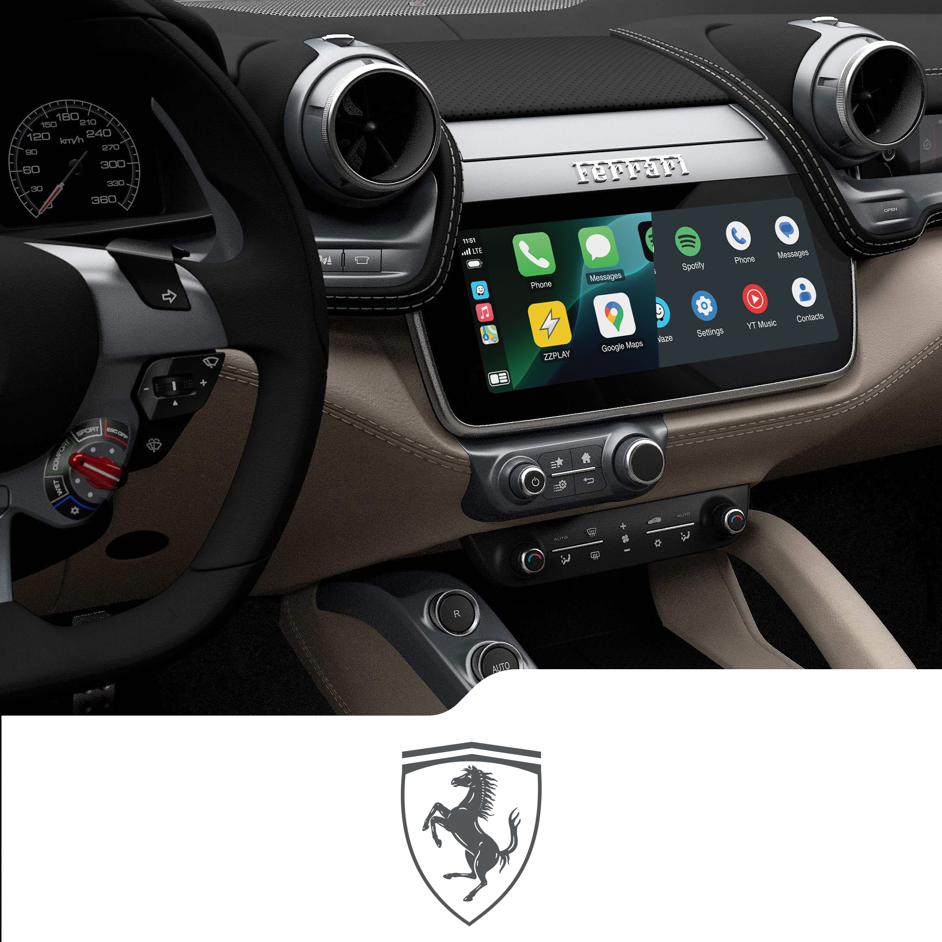 Wireless CarPlay/Android Auto, Camera and A/V interface compatible with Ferrari.
